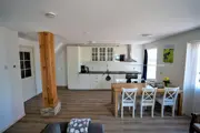 De ruime woonkamer van appartement De Reeing heeft een zithoek met tv en een eethoek. De open keuken is ingericht met een inductiekookplaat, koelkast, vrieskast, oven, magnetron, vaatwasser, waterkoker en koffiezetapparaat. Er is een toilet beneden. Op de bovenverdieping is een slaapkamer met 2 eenpersoonsbedden en tv. En er is een knusse tweepersoons bedsteekamer met wastafel. De badkamer heeft een douche, wastafel en toilet. Het appartement heeft een terras. Tuinmeubilair is aanwezig.