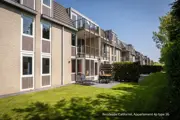 Dit appartement type 5B heeft een privé sauna en ligt op de begane grond. De woonkamer heeft een zithoek met tv, radio en cd-speler. Ook is er een eethoek. De open keuken is ingericht met 4-pits elektrisch comfort, vaatwasser, koelkast met vriesvak en magnetron. Er zijn twee slaapkamers met een tv en comfortabele bedden. De badkamer beschikt over een ligbad, wastafel, toilet en aparte douchecabine. Dit appartement heeft een terras. Tuinmeubilair is aanwezig.