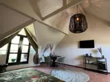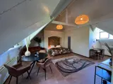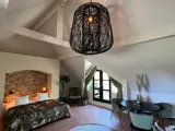 Een 2-persoons riante suite op de eerste verdieping (te bereiken via trap). In deze kamer vind je een extra hoek waar je comfortabel kunt vertoeven op de bank of twee heerlijke lounge stoelen. Dimbare verlichting in de robuuste lampen geven extra sfeer. Grote ronde tafel met comfortabele stoelen, ook ideaal om aan te werken. De badkamer is voorzien van een bad en aparte douche.