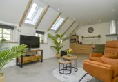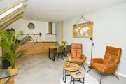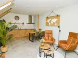 Via de entree kom je in de woonkamer van het appartement met eethoek, zithoek en smart tv. De open keuken heeft alle comfort. Slaapkamer met een tweepersoonsbed en een tweede smart tv. In het gehele appartement is goed werkende Wifi aanwezig. De badkamer heeft een regendouche, wastafel en toilet. Je hebt een eigen terras met uitzicht op het weiland waar de schapen grazen.