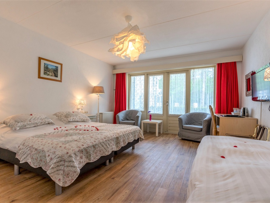 De ruime 3-persoons kamer heeft 3 eenpersoons boxspringbedden en een zitje met flatscreen tv. Een minibar is aanwezig. De badkamer heeft een bad of douche en toilet.