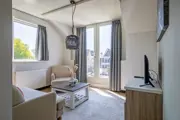 Suite type Strandsuite heeft een zithoek met flatscreen tv en een eethoek. In de suite staan 2 eenpersoons boxspringbedden. De open pantry is ingericht met een koelkast met vriesvak, vaatwasser, waterkoker en Nespresso apparaat. De badkamer heeft een douche, wastafel en toilet. Deze suite heeft een Frans balkon.