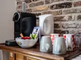 De tuinkamer 'Nuka' bevindt zich op de begane grond. Je hebt een eigen ingang vanuit de tuin. De woonkamer heeft een gezellige ontbijtplek, een zithoek en een koffiehoekje voorzien van een Nespresso koffiemachine, waterkoker en een koelkastje. De slaapkamer is ruim en heeft een boxspring bed (180 x 210 cm). Je badkamer heeft een regendouche en zwevend toilet. Je beschikt over een terras met zitje voor de kamer. B&B De Oude Skuur heeft een grote tuin waar je - samen met de eigenaar en de eventuele bewoners van de andere kamers - gebruik van kunt maken.