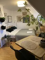 Studio 1 is gelegen op de eerste verdieping en beschikt over een lits jumeaux / 2 boxsprings. De studio heeft aansluitend een badkamer, voorzien van douche, toilet en dubbele wastafel. Ook is er een zeer complete kitchenette aanwezig met alle faciliteiten die nodig zijn om zelf te kunnen koken en eten.