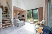 Vanuit de hal komt je in de ruimtelijke, lichte woonkamer die met twee hoge schuifpuien in directe verbinding staat met de tuin. De kamer heeft een apart eetgedeelte met een robuuste eikenhouten eettafel. De stoere ruime keuken is compleet ingericht met inductiekookplaat, magnetron/oven, koelkast, vriezer, vaatwasser, Nespresso machine, melkschuimer, broodrooster en allerhande hoogwaardig keukengerei. Er is een gezellige zithoek met ruime comfortabele hoekbank, Interactieve TV, soundbox en een apart leeshoekje met twee loungestoelen. Verder is er beneden een slaapkamer met een boxspringbed (210 lang) en aangrenzende badkamer met inloopdouche, wastafel en toilet. Er is ook een separaat toilet.