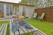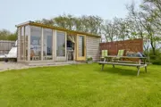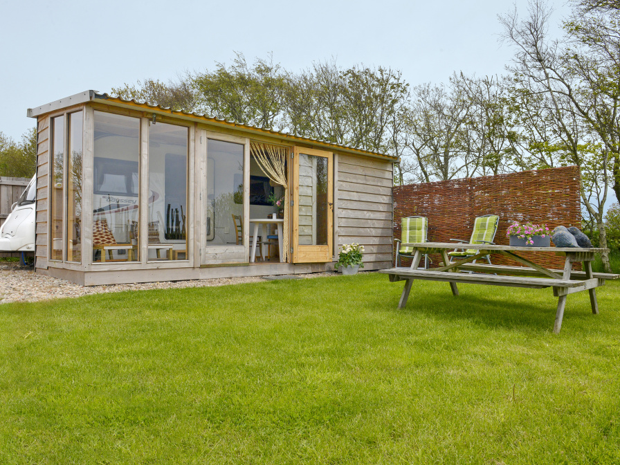 Deze caravan is sfeervol ingericht met een zithoek/eethoek met flatscreen tv, keuken met drie-pits gasstel, één elektrisch kookplaatje, koelkast met vriesvak, oven, grilloven, magnetron, waterkoker en filterkoffiezetapparaat. De slaapkamer heeft een tweepersoonsbed (140 x 200). In de caravan is een douche, het toilet is apart en bereikbaar via de veranda. De caravan heeft een beschutte veranda met openslaande deuren die volledig afgesloten kunnen worden. Vanaf de veranda en het privéterras is het heerlijk genieten van het weidse uitzicht, het gefluit van vogels en van mooie luchten. Er is een picknicktafel aanwezig.