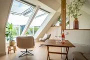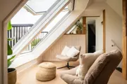 Deze ruime tweepersoonskamer op de eerste verdieping is compleet en stijlvol ingericht. De kamer heeft een tweepersoons bed met twee matrassen en eenpersoons dekbedden en een zitje. De moderne badkamer is voorzien van een regendouche, ligbad, wastafel en toilet. De kamer heeft grote dakramen waarmee je een “terras” kunt creëren op je eigen kamer.