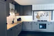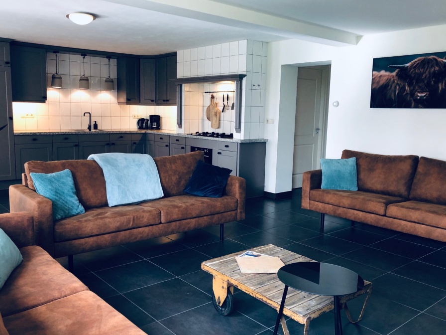 Entree, woonkamer met zithoek en flatscreen tv, eethoek met openslaande tuindeuren naar het privé terras met tuinmeubels. Een ruime landelijke open woonkeuken met o.a. vaatwasser, combimagnetron, koffiezetapparaat en waterkoker. Een toilet met wastafel, aparte badkamer met douche en wastafel. Slaapkamer met twee éénpersoons bedden en een eigen badkamer met douche, toilet en wastafel.