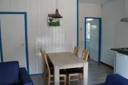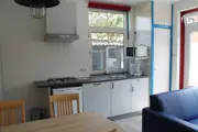 De woonkamer van dit geschakelde vakantiehuis heeft een zithoek met tv en een eethoek. De eenvoudige open keuken is ingericht met een gasfornuis, vaatwasser, combimagnetron en koelkast met vriesvak. Er is ook een waterkoker en een Senseo. Er is een slaapkamer met twee eenpersoons-boxspringbedden (80 x 200). De badkamer heeft een douche en toilet. Op de eerste verdieping zijn twee eenpersoons-boxspringbedden (90 x 200). Deze verdieping is bereikbaar via een steile trap. Dit vakantiehuis heeft een eigen terras met tuinmeubilair.