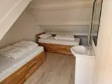 Deze vijf-persoons vakantiewoning heeft een woonkamer met zithoek en eettafel. In de woonkamer is een steile trap naar de verdieping waar zich 2 slaapkamers bevinden. De open keuken is voorzien van o.a. afwasmachine en combimagnetron. Op de begane grond is een één-persoons slaapkamer 90x200cm en een badkamer met douche en toilet. Op de verdieping zijn 2 slaapkamers voorzien van wastafel, één met 2 één-persoons bedden 90x200cm en één slaapkamer met een tweepersoonsbed 140x200cm. Er is een traphekje aanwezig.