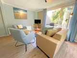 De woonkamer is voorzien van een zithoek met tv. Er is een eethoek. De open keuken is ingericht met een koelkast, koffiezetapparaat, Nespresso, Quooker en magnetron. Een trap vanuit de toegangshal brengt je naar de slaapkamers. Er zijn twee slaapkamers met elk 2 eenpersoons boxspringbedden en een wastafel. De badkamer heeft een douche, wastafel en toilet. Dit hoekappartement ligt op de 1e etage, heeft een balkon en een uitzicht over de weilanden en naar het bos.