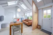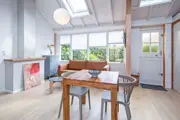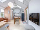 Het huisje heeft een woonkamer met tweezitsbank, eettafel en Smart TV en een open keuken met 4 inductie kookplaten, een Nespresso, broodrooster, combimagnetron en een koelkast met vriesvak. De aparte slaapkamer heeft een tweepersoons bed (160 x 200 cm, twee eenpersoons matrassen) en een badkamer 'en-suite' met wastafel, toilet en een inloopdouche met regendouche. Alles gelijkvloers. Via openslaande deuren kom je op je terras met zitje en parasol en een eigen omheinde tuin (circa 40m2).