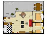 De keuken van appartement Hof is ingericht met combimagnetron, koelkast met vriesvak, vaatwasser, waterkoker en Senseo. De woonkamer heeft een zithoek met tv. Er is ook een eethoek. Er zijn twee slaapkamers, waarvan een met tweepersoons-boxspringbed. De andere slaapkamer heeft twee eenpersoons-boxspringbedden. De badkamer heeft een bad en toilet. Appartement Hof heeft een terras.