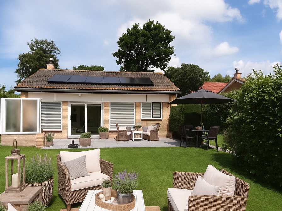 De woonkamer van dit vrijstaande vakantiehuis heeft een zithoek met tv en een eethoek. De open keuken is ingericht met koelkast, vriezer, combimagnetron en vaatwasser. Er zijn drie slaapkamers 1 met tweepersoonsbed (eenpersoonsmatrassen) 1 met twee eenpersoonsbedden en 1 met een stapelbed. Er is een doucheruimte met daarnaast een separaat toilet. Dit huis heeft een tuin met terras. Tuinmeubilair is aanwezig.