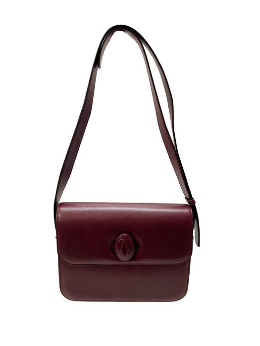 Cartier vintage tas in bordeauxrood leer, een klassieker van het huis, draaibare opening met maxi-logo op de voorkant, verstelbare schouderriem.