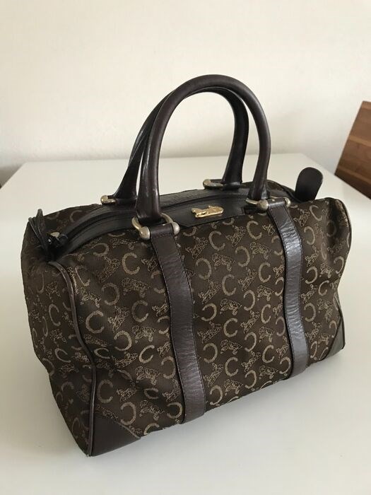 Kleine Celine mini Boston handtas in bruin/beige kleur met 1 groot vak en1 kleiner vak, beide met ritssluiting.
