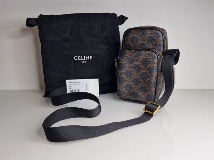Deze CÉLINE Triomphe canvas kalfsleren mini-pocket koerierstas in zwart. Deze chique crossbody tas is gemaakt van triomphe canvas in zwart. De schoudertas heeft een verstelbare nylon schouderriem met gouden schakels en ritsen. De meerdere ritsen openen naar ruime bruine stoffen interieurs. Dit is een elegant eenvoudige maar functionele schoudertas, ideaal voor dagelijks gebruik, met de klassieke innovatie van Celine!