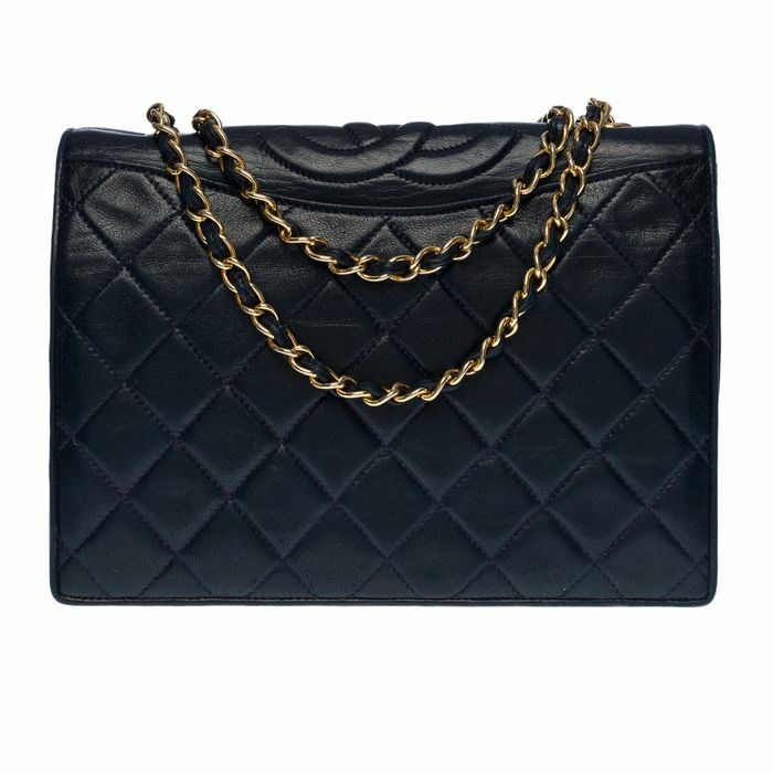 Mooie Chanel handtas met volledige klepzakken in marineblauw gewatteerd lamsleer, hardware in verguld metaal, een kettingriem in verguld metaal verweven met marineblauw leer om op de schouder en over het lichaam te dragen