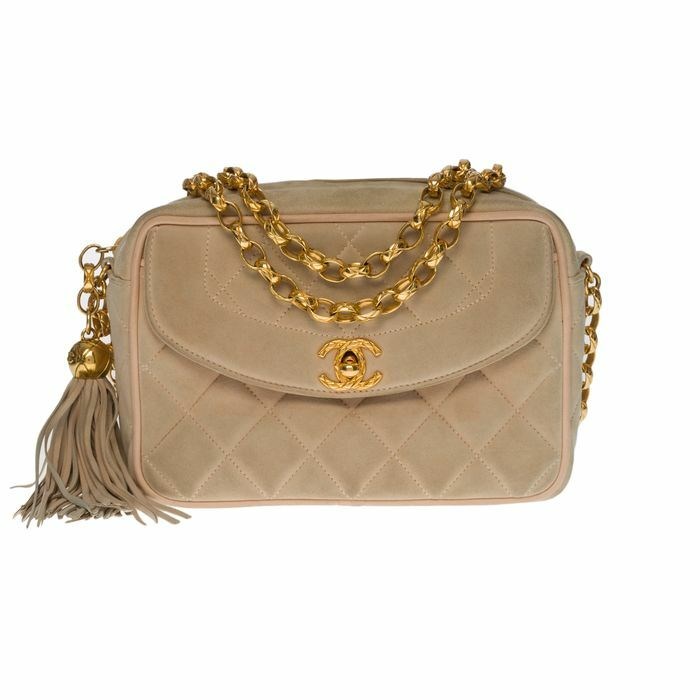 Mooie Chanel Mini Camera Front Pocket handtas uit de "Coco Crush" collectie in crèmekleurig suède, poederroze kleur rushes, vergulde metalen hardware, een vergulde metalen ketting voor de schouder en crossbody