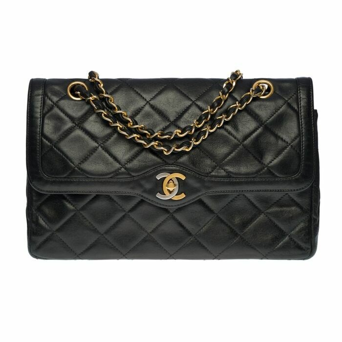 Prachtige Chanel Classique handtas met dubbele klep in zwart gewatteerd lamsleer, hardware in verguld metaal, een kettingriem in verguld metaal verweven met zwart leer waardoor de tas op de schouder en over het lichaam kan worden gedragen