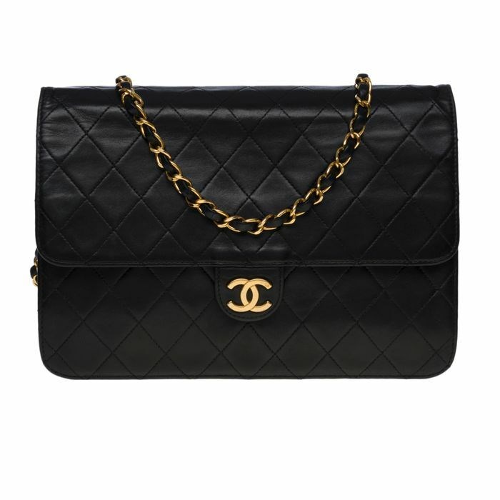 Zeer chique medium Chanel Classique tas met klep van zwart gewatteerd leer, hardware van verguld metaal, een kettingriem van verguld metaal verweven met zwart leer waardoor de tas op de schouder of over het lichaam kan worden gedragen