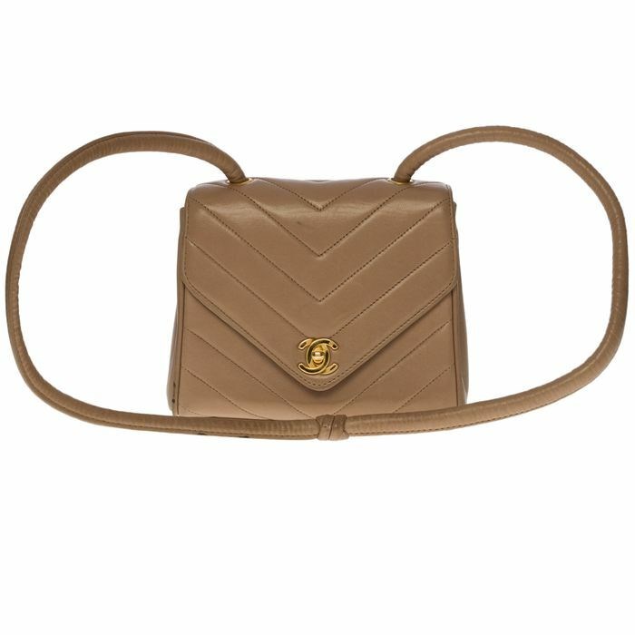 Mooie Chanel Mini Flap bag visgraat handtas in taupe lamsleer, hardware in verguld metaal, een handvat in buisvormig taupe leer met worst om op de schouder en over het lichaam te dragen