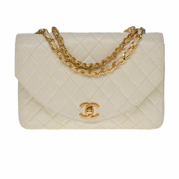 Zeer mooie Chanel Classique Flap bag handtas in ecru gewatteerd lamsleer, hardware in verguld metaal, een kettingriem in verguld metaal verweven met ecru leer waardoor de tas op de schouder of over het lichaam gedragen kan worden