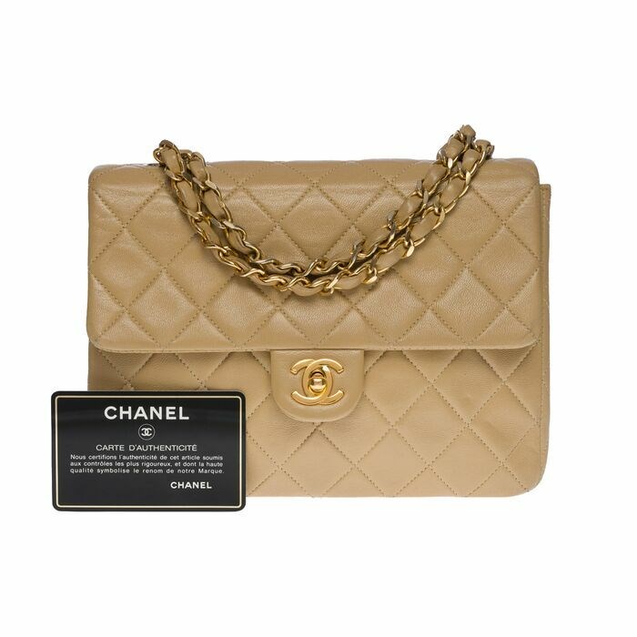 Schitterende Chanel Mini Tijdloze vierkante tas met flap van beige gewatteerd lamsleer, schouderriem van verguld metaal verweven met beige lamsleer waardoor de tas in de hand, op de schouder of over het lichaam gedragen kan worden