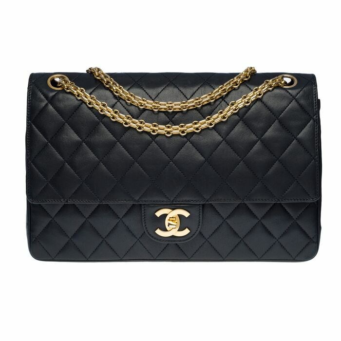 Prachtige Chanel Timeless/Classique handtas van 27 cm met dubbele klep in navy gewatteerd leer, hardware in verguld metaal, een Mademoiselle-ketting in verguld metaal waardoor de tas op de schouder kan worden gedragen