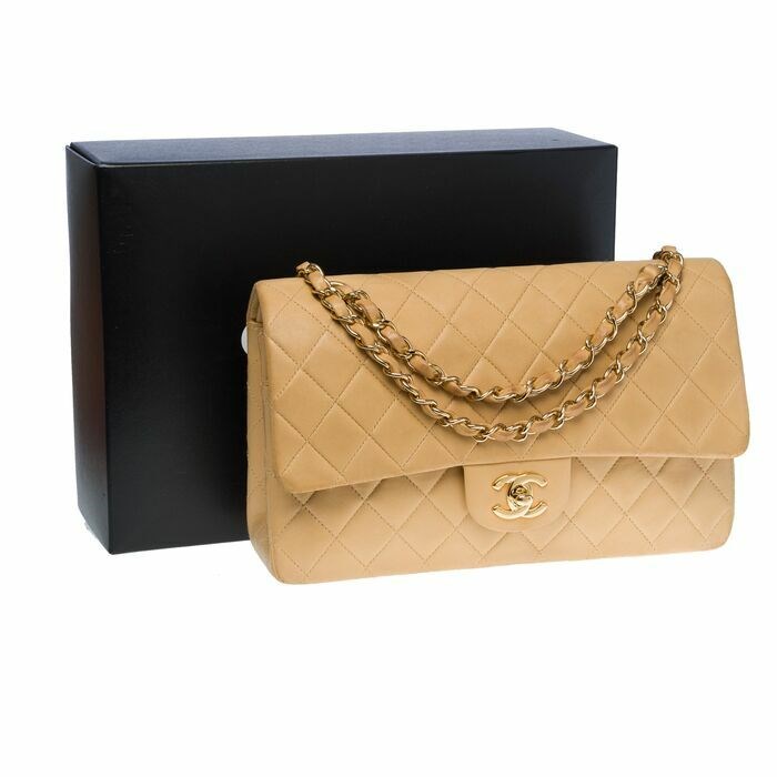 De iconische "Must Have" Chanel Tijdloze medium tas van 25 cm met dubbele klep van beige gewatteerd lamsleer, vergulde metalen hardware, vergulde metalen ketting verweven met beige leer voor schouder- en schouderdraagtassen