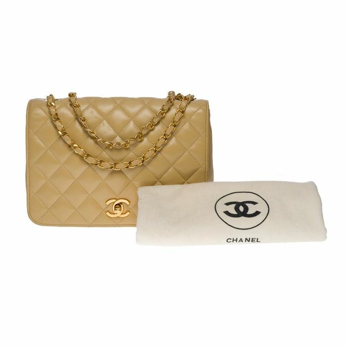 Prachtige Chanel Classique Full Flap MM handtas in beige gewatteerd lamsleer, hardware in verguld metaal, een kettingriem in verguld metaal verweven met beige leer waardoor de tas op de schouder en over het lichaam kan worden gedragen