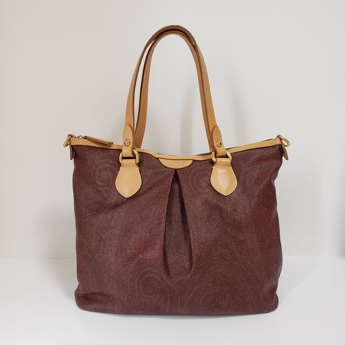 Deze Etro tas is in goede gebruikte staat. Het buitenleer ziet er goed uit zonder duidelijke krassen. Het bruine leren handvat en de randen en de onderkant zien er allemaal nog goed uit, zonder schade, alleen lichte krassen op het oppervlak en lichte slijtage aan de leren handvatten. Rits loopt soepel. Zoom in op de foto's voor de details. Het interieur is mooi schoon en heeft geen onaangename geur. Aan weerszijden zitten D-ringen voor een afneembare schouderriem. *Geen schouderriem.*
