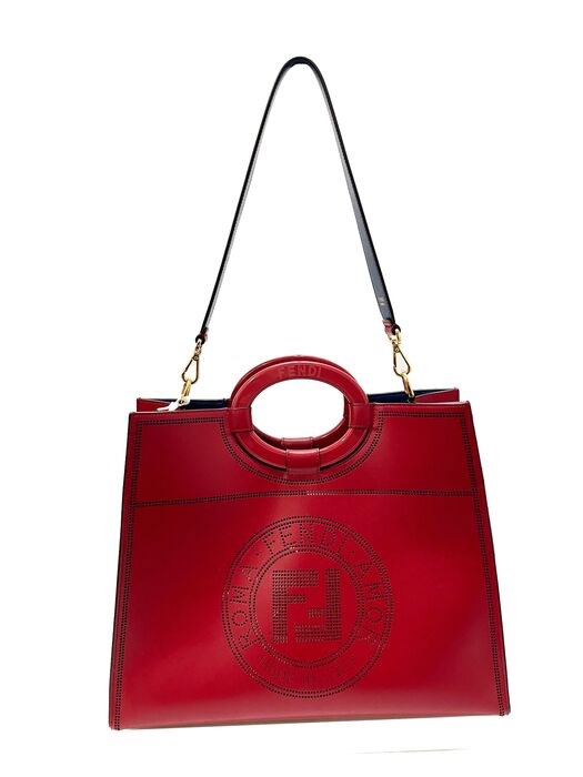 Fendi Runaway in rood leer met geperforeerd Fendi-logo, contrasterende blauwe binnenkant. Indrukwekkende tas.