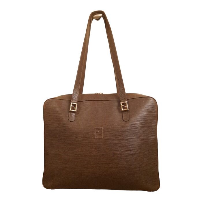 Vintage Fendi draagtas uit eind jaren 80/begin jaren 90 (draagt de vroegere naam van modehuis Fendi SaS). In leer en gecoat canvas, gevlekt tabakskleur gespikkeld met zwart.