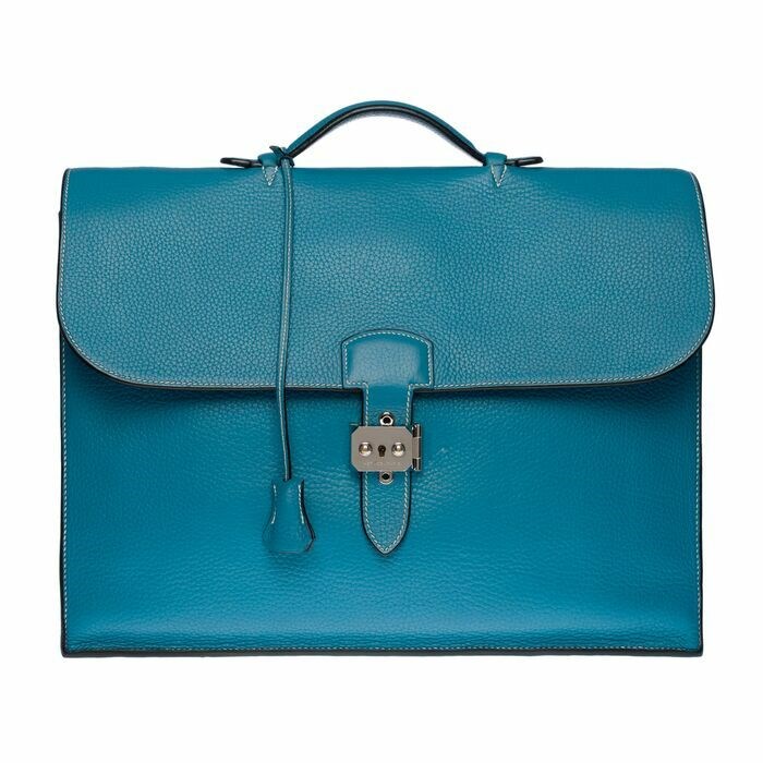 Prachtige en zeer chique Porte-Documents Hermès Sac à dépêches in spijkerbroek Togo leer met witte stiksels, hardware in zilver palladium metaal, eenvoudig handvat in blauw leer waardoor het in de hand kan worden gedragen