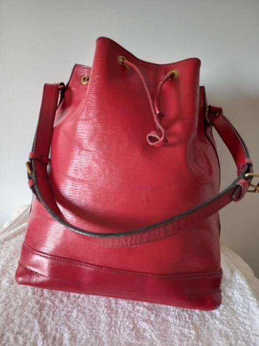 Louis Vuitton noé tas met verstelbare rode schouderband, ritssluiting aan de binnenkant, zwarte alcantara binnenkant. Sluit met een leren koord. In een goede staat