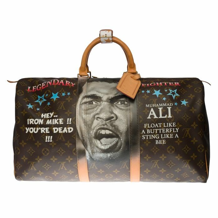 De kunstenaar PatBo heeft een prachtige tas gemaakt met als thema "Muhammad Ali" van een Keepall 50 in bruin monogram canvas met schouderriem om een uniek stuk te creëren
