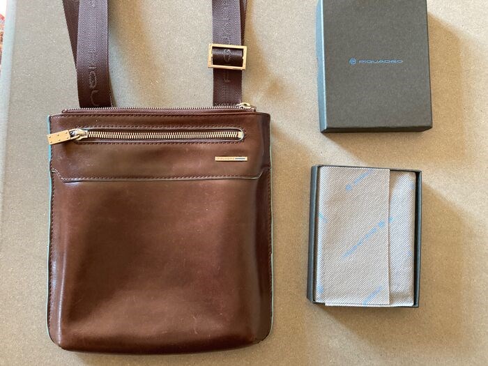 Prachtig paar herenaccessoires van fijn Italiaans leer met zachte, suikerblauwe rubberen afwerkingen. Nooit gebruikt, vrij van slijtage.