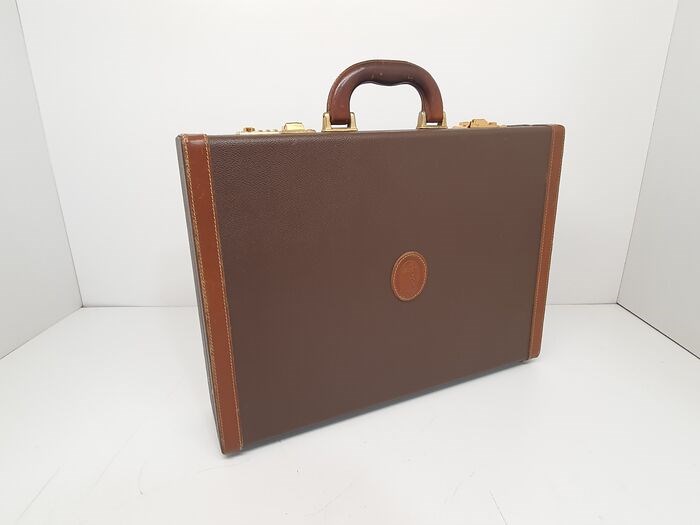De tas meet 42 x 30 x 10 cm. Bruin leer, het interieur bekleed met stof met logo en met het plaatje met de naam van de fabrikant, Made in Italy.