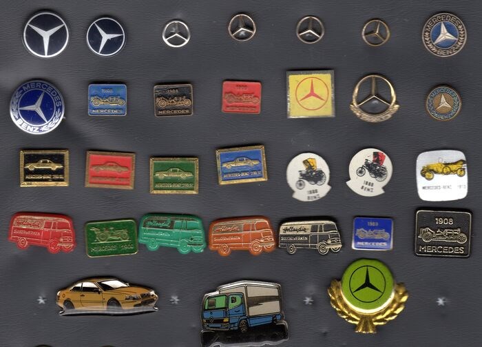 Collectie van 29 speldjes en 2 pins MERCEDES waaronder 1 verguld met opdruk 200.000 km