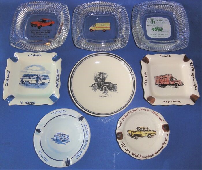 5 Oude Porceleinen Stenen Auto Asbakken & 3 van Glas