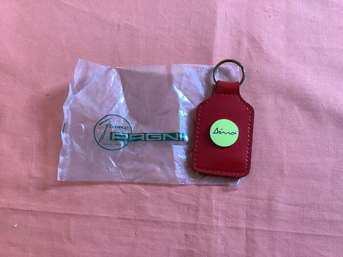 Prachtige Ferrari Dino sleutelhanger uit 1970 in echt rood leer met geëmailleerd logo, nieuw, nooit gebruikt, nog in originele tas, destijds erkende fabrikant (Spiders), inventarisitem voor topverzamelaars van het merk Ferrari, veilige verzending per koerier