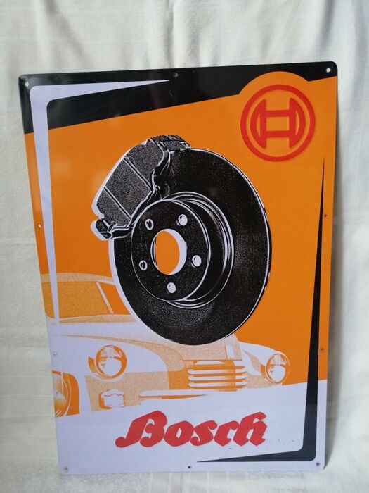 Bosch blikken reclame plaat met een afbeelding van een oude auto en een Remschijf met remklauw in een reliëf met de vintage letters Bosch , deze reclame plaat was niet te koop in de reguliere handel maar was te verkrijgen door leden van garage bedrijven die aangesloten zijn bijBosch Car Service en een speciale cursusvolgden , het is een mooi item voor de verzamelaar van automobilia of als decoratie in een mancave of bij je oldtimer ,het bord is gemonteerd geweest en heeft lichte gebruikers sporen, zie de foto's voor een goede beoordeling , wordt goed verpakt en snel verzonden