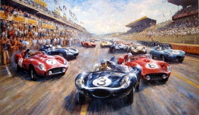De start van de Le Mans-race van 1957, gewonnen door een D-Type Jaguar nr. 3 bestuurd door Ivor Bueb en Ron Flockhart. Ook op de foto is de D-Type nummer 15 die als tweede eindigde, bestuurd door Sanderson en Lawrence. D Type nummer 17 werd derde gereden door Lucas en Brousselet, D type nummer 16 werd 4e gereden door Frere en Rousselle.Evans en Severi in Ferrari nummer 8 werden 5e en tenslotte D Type 4 van Hamilton en Gregory werd 6e.