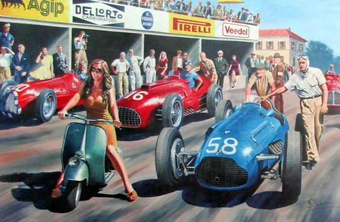 Deze compositie is een fictie. In 1950 verscheen Gina Lollobridgida, de muze van de Italiaanse cinema in de jaren vijftig, plotseling op haar Vespa midden in de weilanden van de Grand Prix van Monza. Naast haar talent als actrice stond ze bekend om haar grote borsten, en Louis Rosier, Juan Manuel Fangio, Alberto Ascari en Nino Farina zullen het niet ontkennen! Dit schilderij is ook een bloemlezing van de grote coureurs van die tijd (we zien ook Philippe Etancelin, Raymond Sommer, Louis Chiron, Enzo Ferrari) en een eerbetoon aan hun magnifieke eenzitters. Je zult het begrepen hebben, ik heb een zwak voor de Talbot T26!
