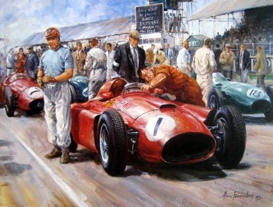 Juan Manuel Fangio met zijn Lancia-Ferrari voorafgaand aan het winnen van de Britse Grand Prix van 1956 op Silverstone