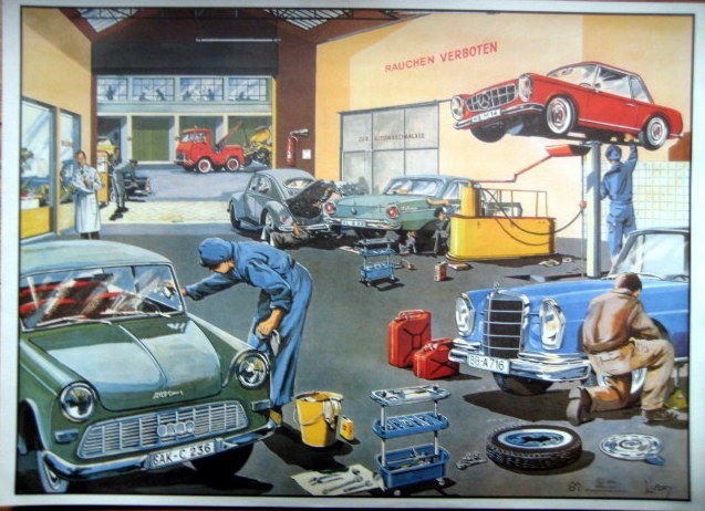 Nostalgische print - Garage eind jaren 60 - Mercedes-Benz 230 Pagode/Mercedes-Benz 230SE /Volkswagen Kever/DKW Junior