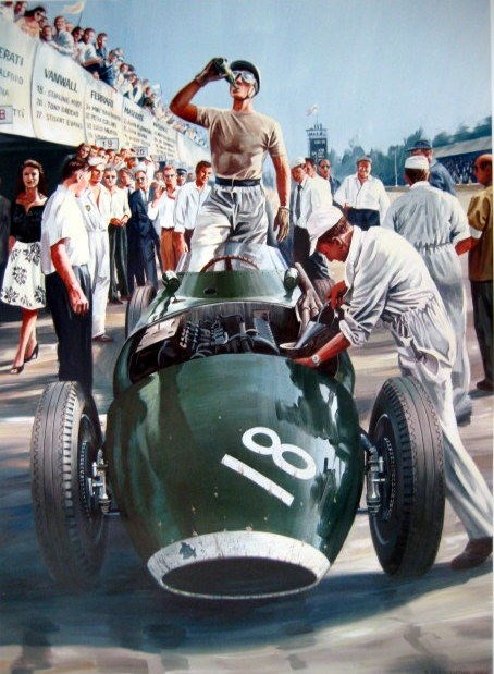 Deze ongebruikelijke compositie toont de Britse piloot Stirling Moss tijdens een pitstop terwijl hij streed om de Italiaanse Grand Prix van 1957 (Monza). Na een motorstoring geeft zijn teamgenoot Tony Brooks toe in zijn auto zodat Moss de Grand Prix kan winnen en Juan Manuel Fangio voorbij kan gaan. Het schilderij toont de nauwe band tussen de toeschouwers en de racepiloten. zou je je vandaag zo'n pitstop voorstellen?
