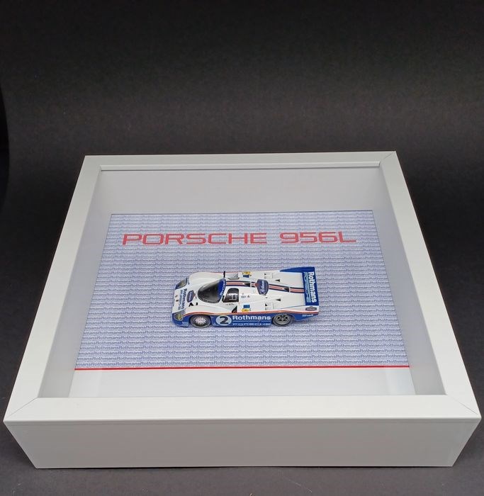 Porsche 956L tweede exemplaar van twee. Om op te hangen of neer te zetten: Afmeting: 27 x 27 x 6 cm Diecast automodel in een houten lijst met plexiglas deksel ( gesloten ). Digitaal printen. De auto is nieuw. Alle modellen zijn te zien op instagram; #christiantingstrom