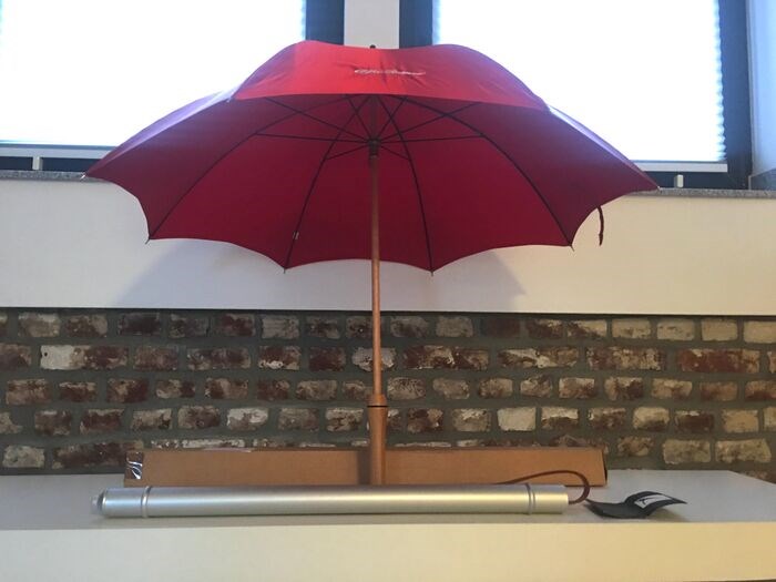 De paraplu heeft een houten handvat met een viscose hoes. De meegeleverde aluminium koker met leren draagriem wordt gebruikt om de natte parasol uit te wringen en te vervoeren.